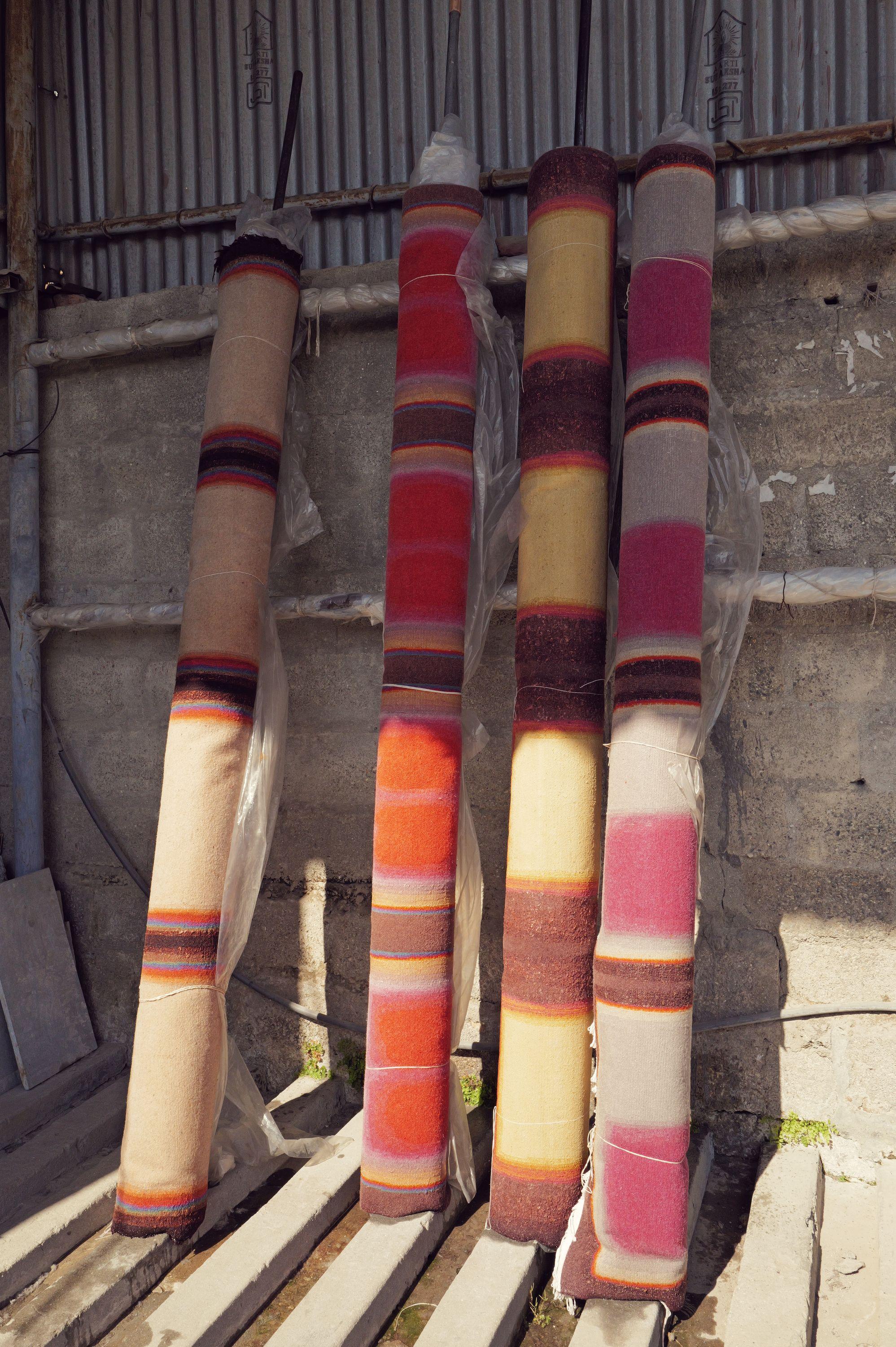 The Color of Copper captures this organic transformation, translating the accidental beauty of oxidation into a warm, radiant color palette, meticulously reproduced by expert artisans through a labor-intensive process. Combining threads of Himalayan wool, pure silk and aloe in alternating saturations, they developed a new color system that mirrors the luminous, ever-changing nature of copper’s surface.