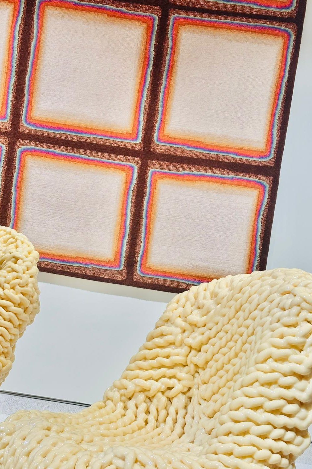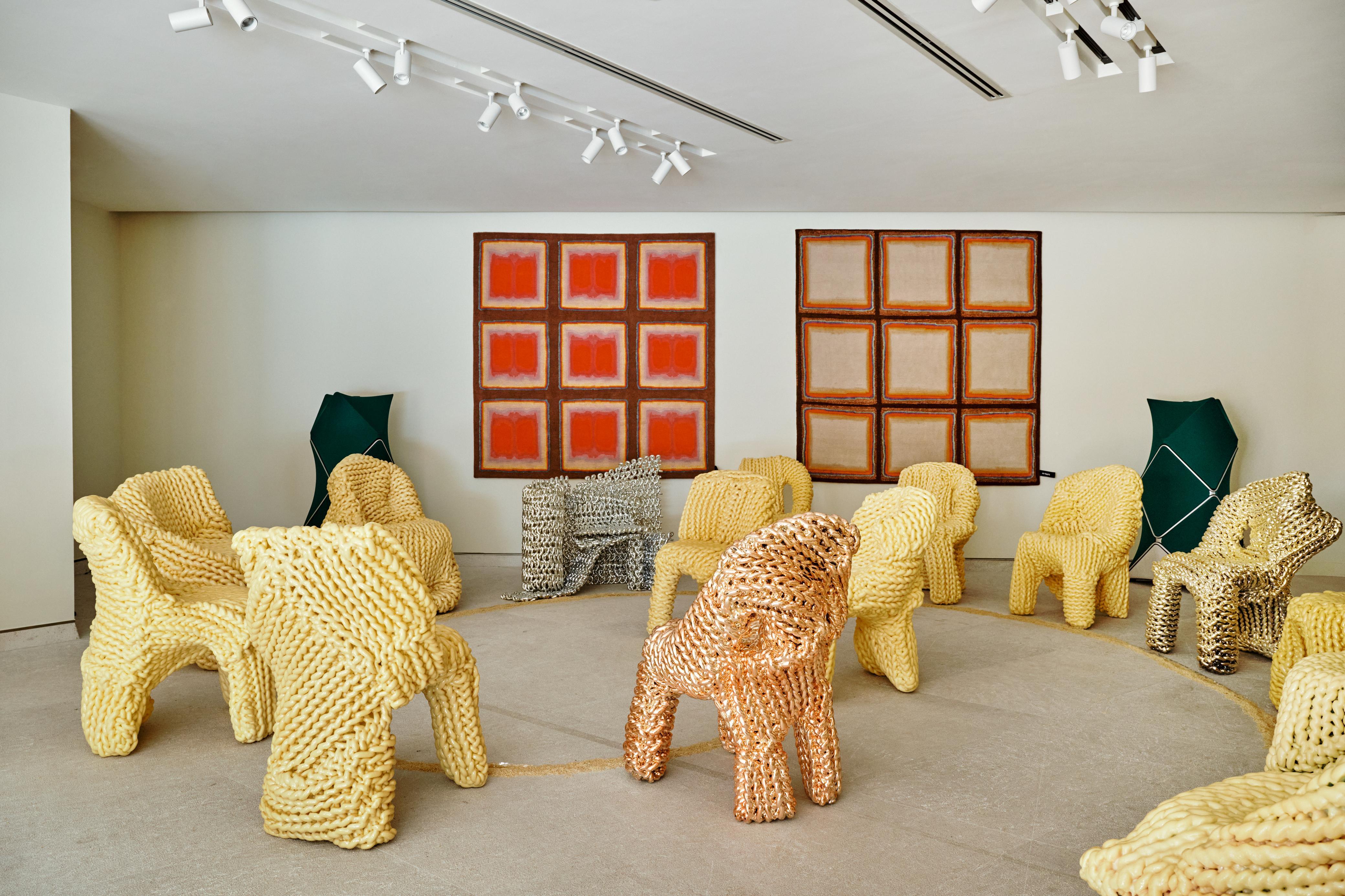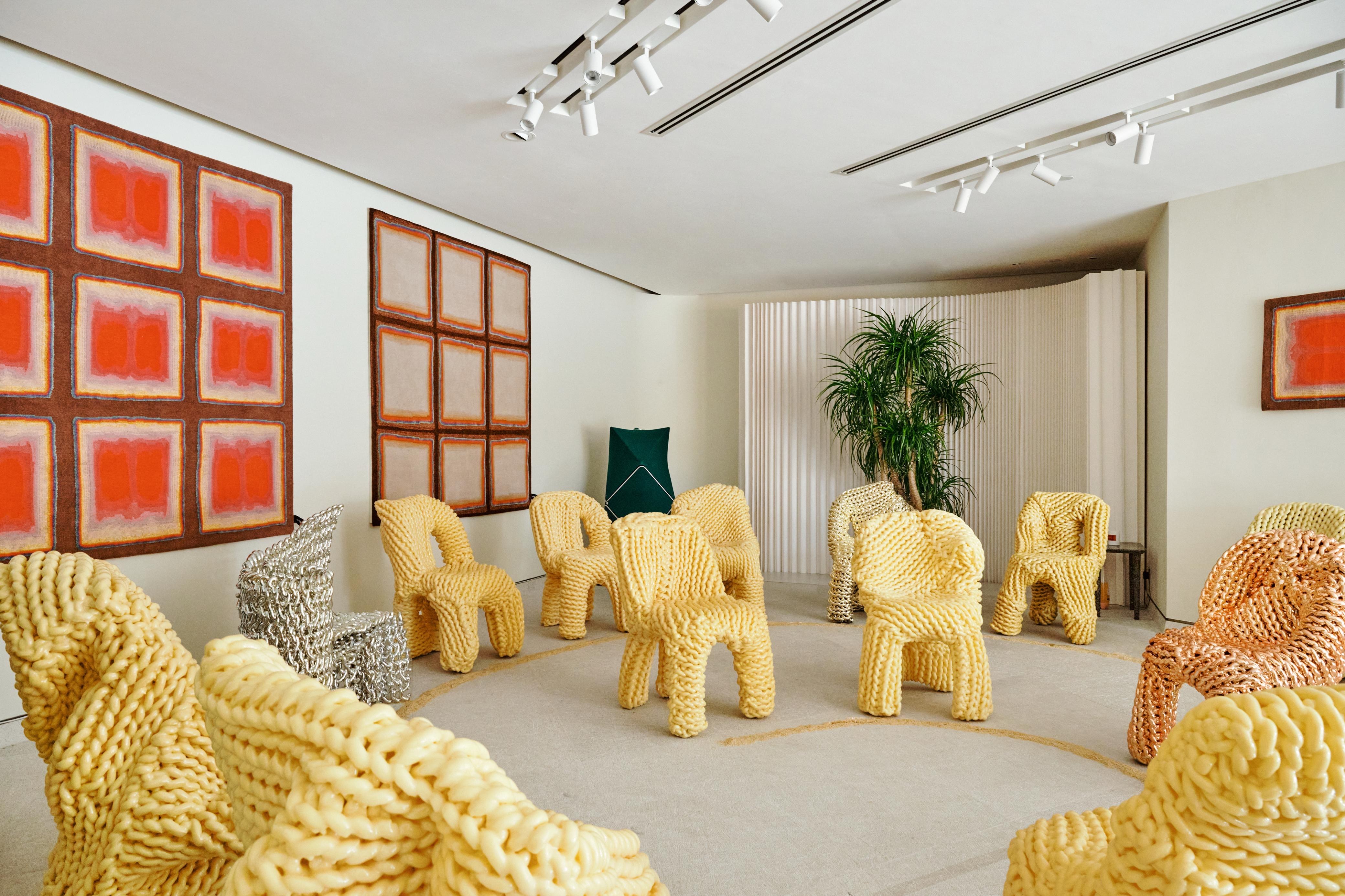 Lee’s chairs, crafted from sponge pipes and nylon rope, then coated in polyurethane, evoked oversized knits and organic, almost living forms. Blurring the line between industrial material and handcraft, they reimagined seating as expressive, sculptural pieces, informed by Lee’s ongoing research into transformation, tactility, and the emergence of the organic from the artificial.