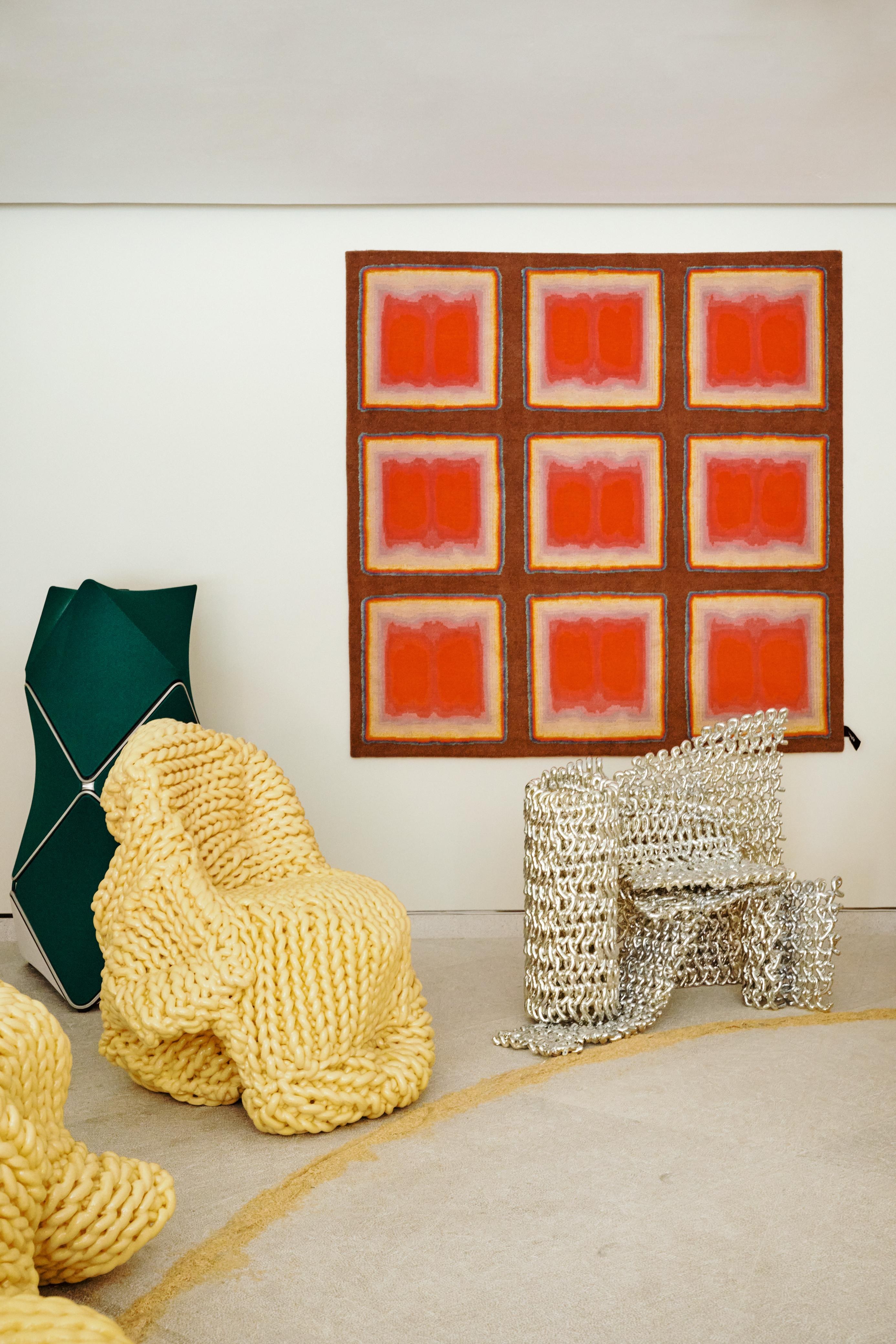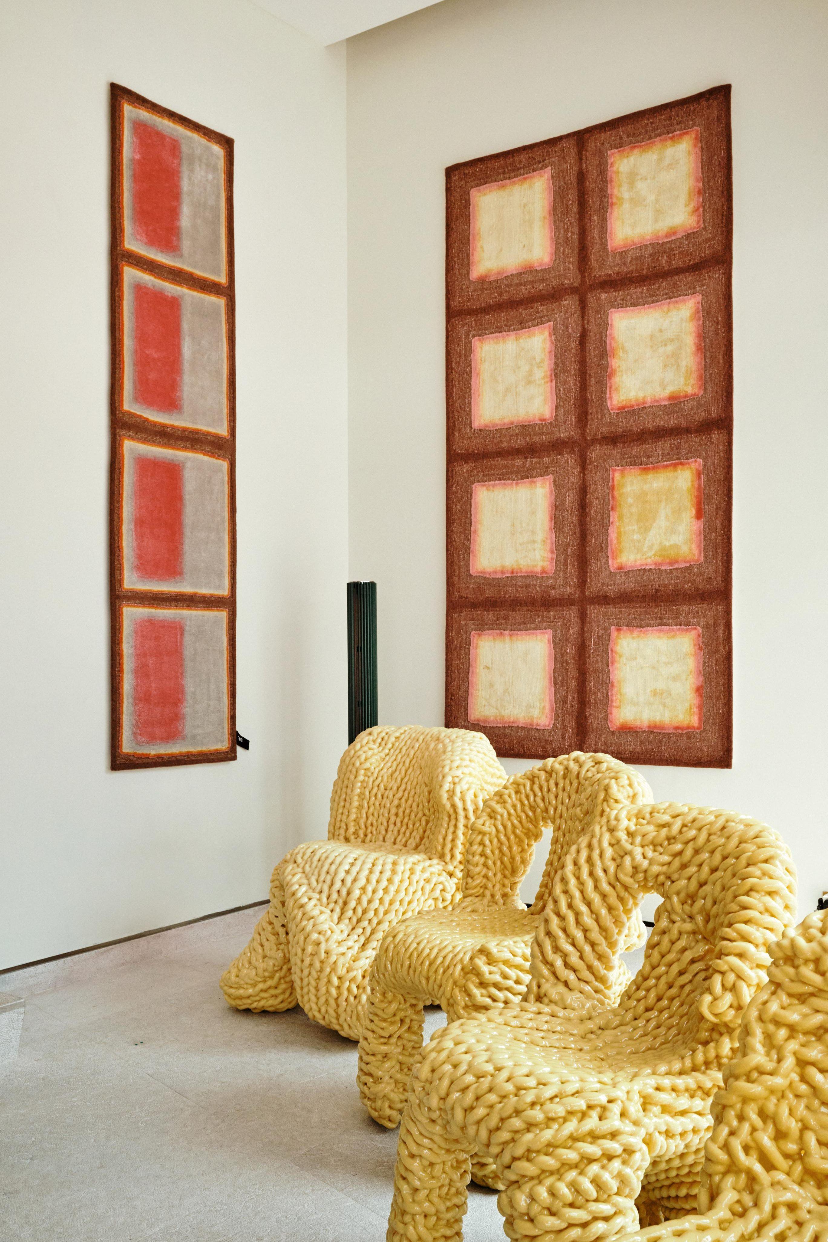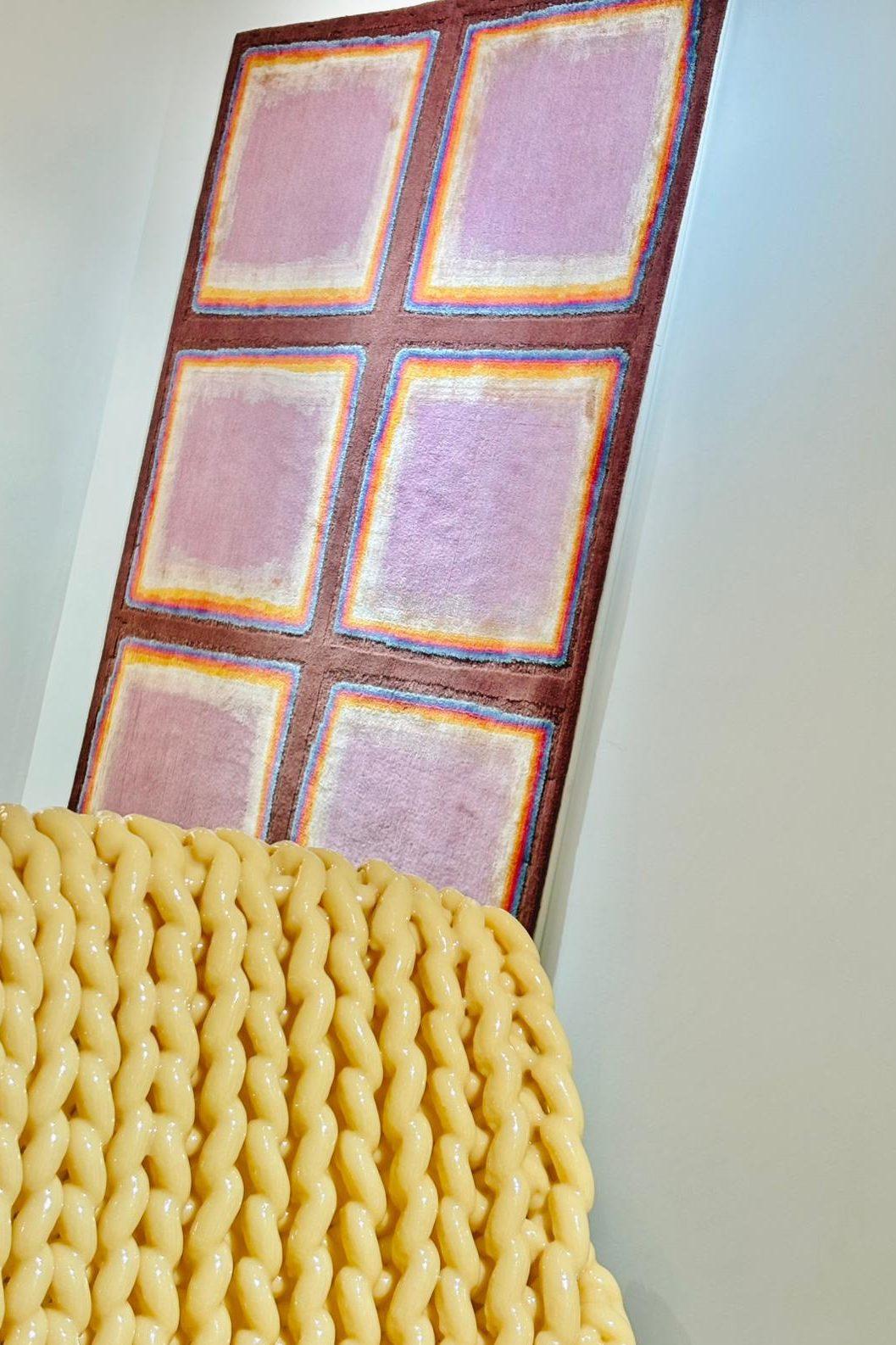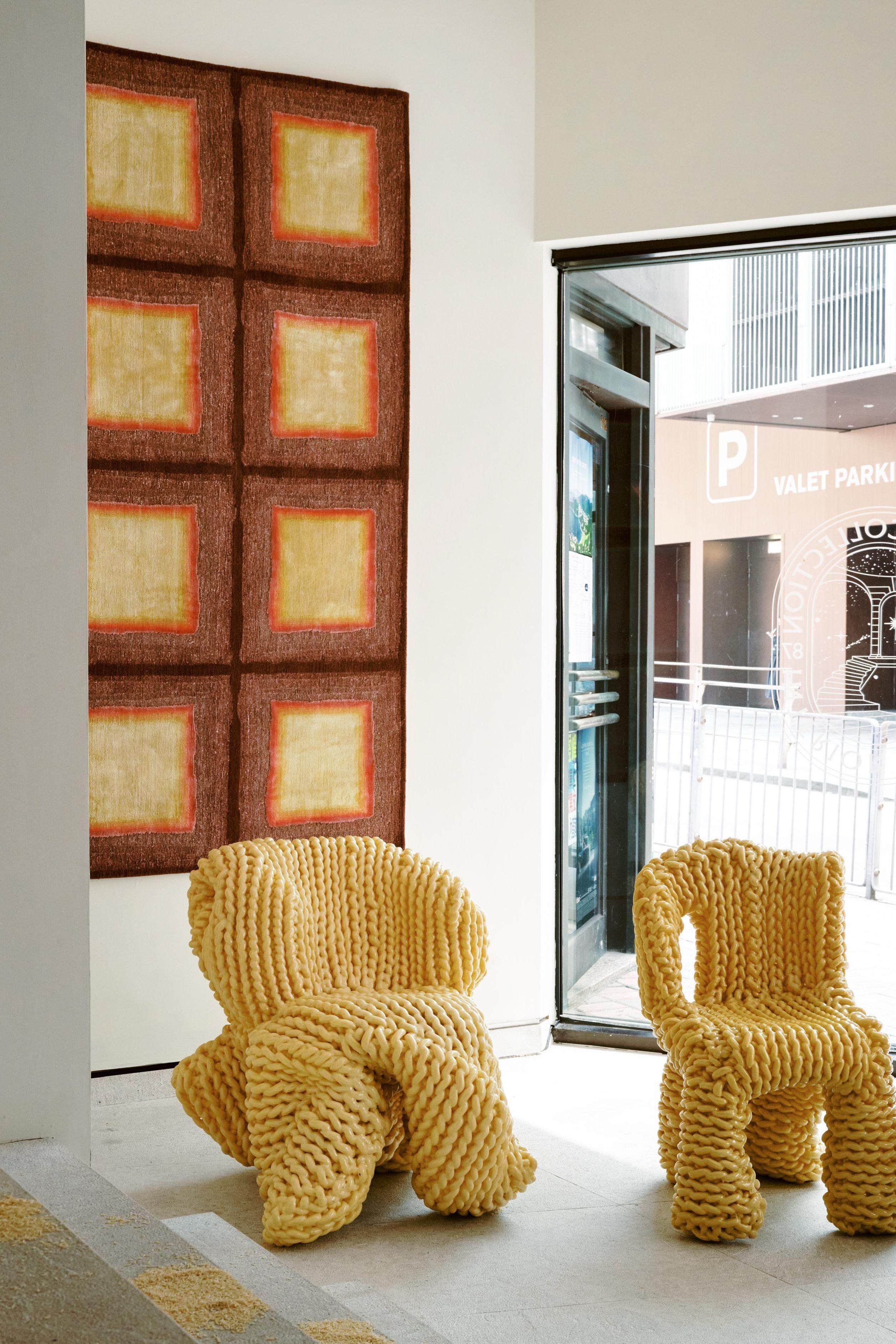 Lee’s chairs, crafted from sponge pipes and nylon rope, then coated in polyurethane, evoked oversized knits and organic, almost living forms. Blurring the line between industrial material and handcraft, they reimagined seating as expressive, sculptural pieces, informed by Lee’s ongoing research into transformation, tactility, and the emergence of the organic from the artificial.