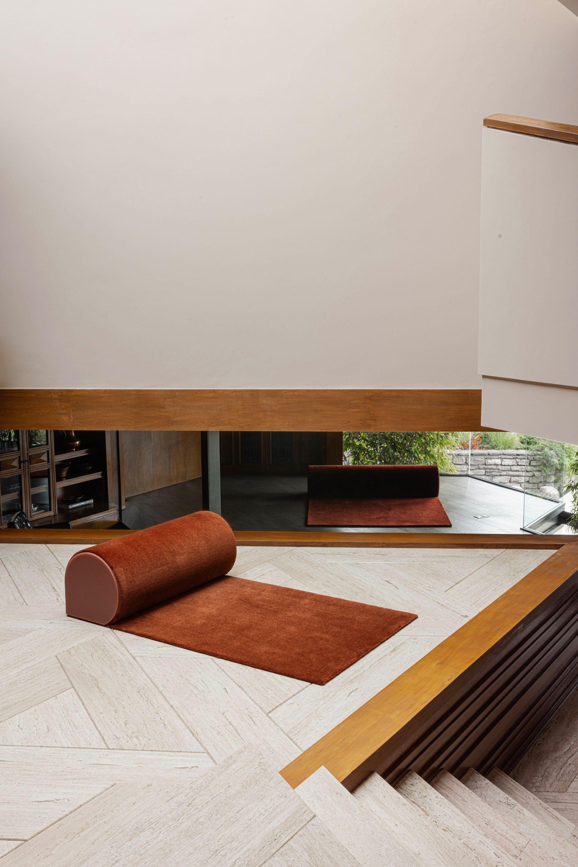 On the occasion of Mexico Art Week, cc-tapis presented Roll, a limited-edition series of three rugs that exist halfway between floor covering and seating, installed in a site-specific project at the Valner Residence, a landmark early-1970s home by architect Agustín Hernández in Mexico City. The work originates from the simple gesture of unrolling, freezing the moment when a rug ceases to be just a surface and begins to take on sculptural presence. Each piece transforms simultaneously into a surface and a seat, making familiar domestic gestures tangible while crystallizing them into singular, poetic forms.