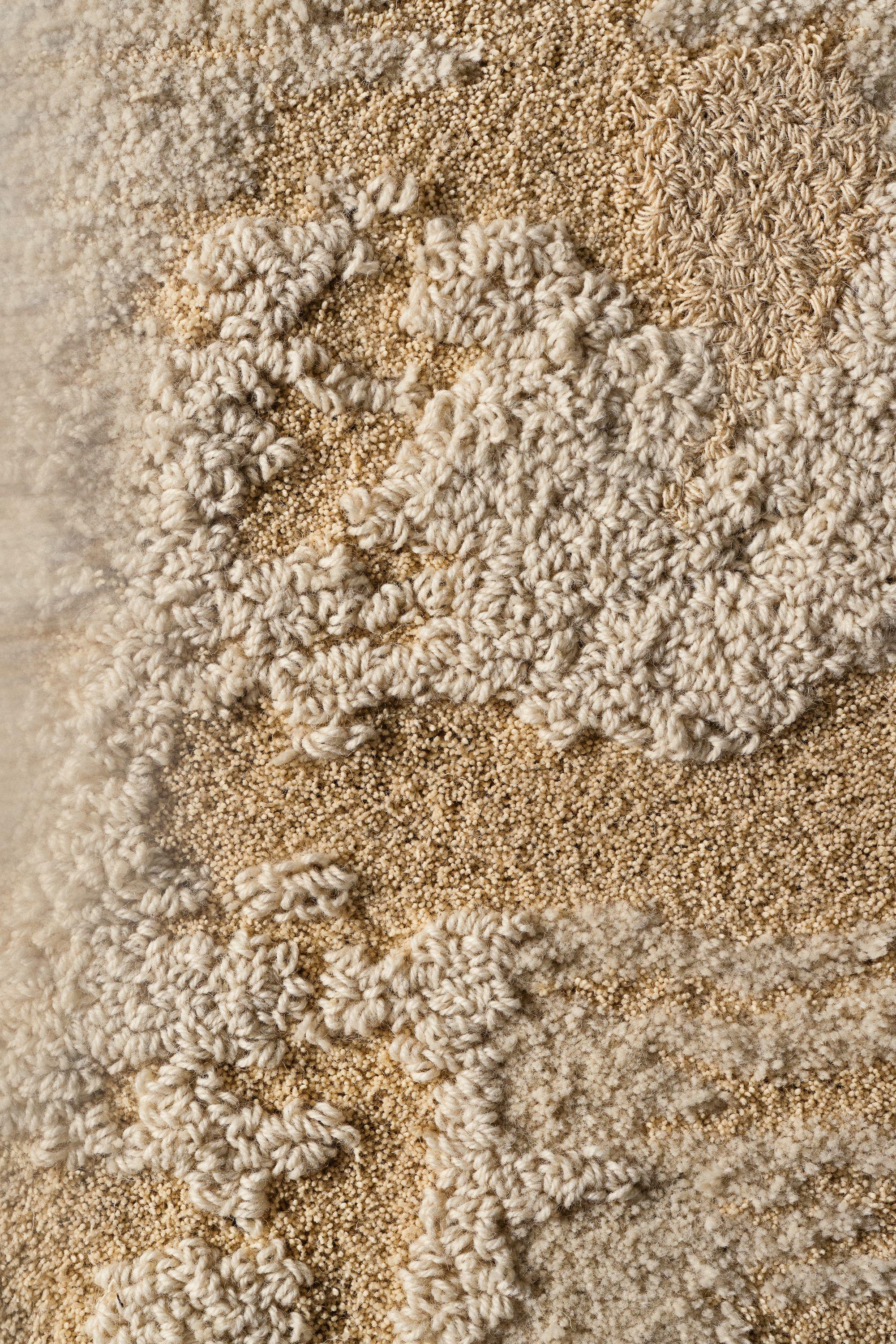 Crafted from dead-stock wool, the reversible rug combines three undyed yarns with varying pile heights and calibrated thicknesses. Through subtle shifts in texture and density, the surface evokes the layered complexity of Mediterranean landscapes while preserving the raw, organic character that defines the project’s material narrative.