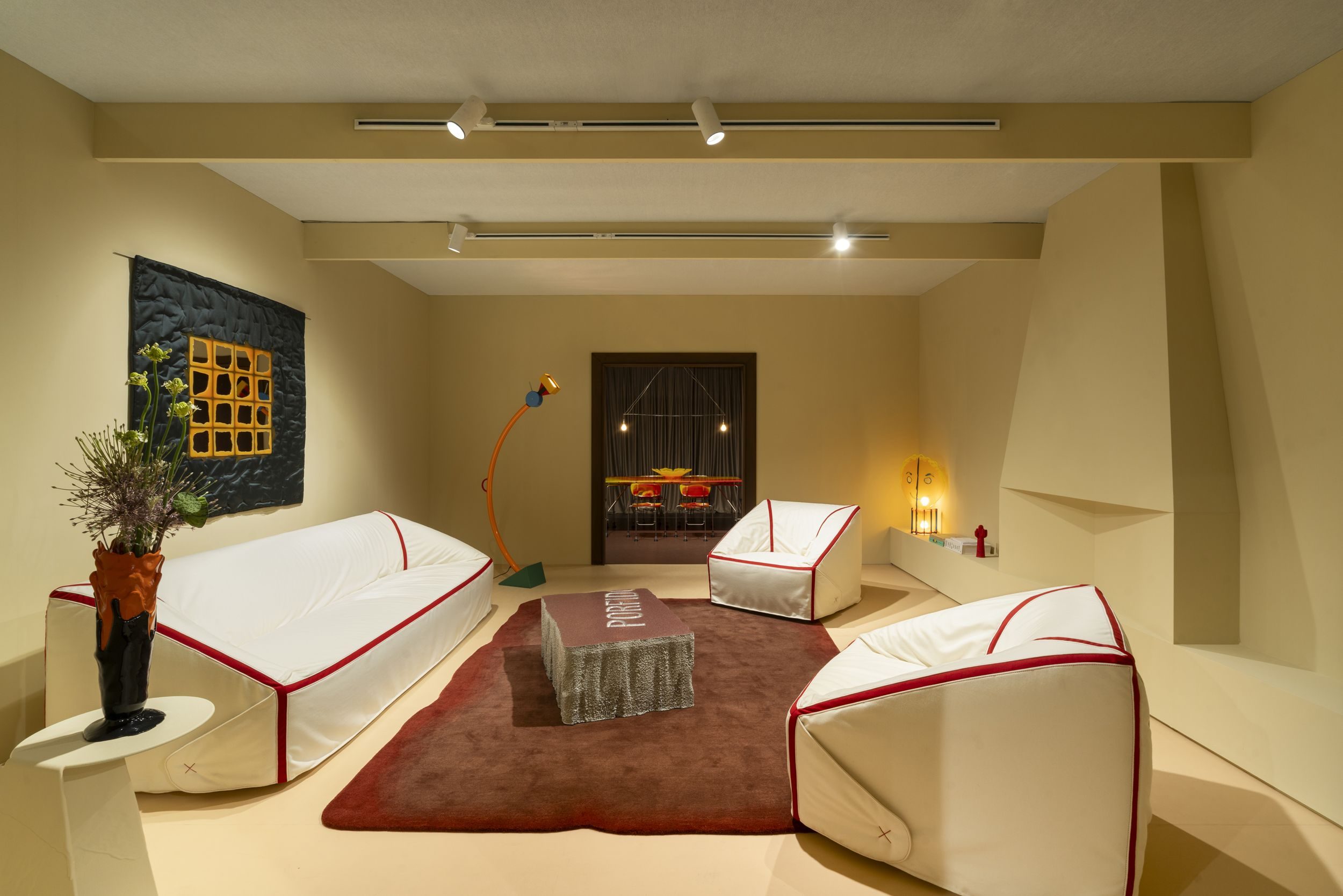 Camera Fissa is an immersive installation by studioutte and De Troupe, presented at studioutte’s Milan headquarters and conceived as a private club interior viewed from a single, centered perspective. Framed by textiles, scenography, lighting, and furniture, the project creates a calm yet cinematic atmosphere in which architecture and objects merge into one cohesive system.