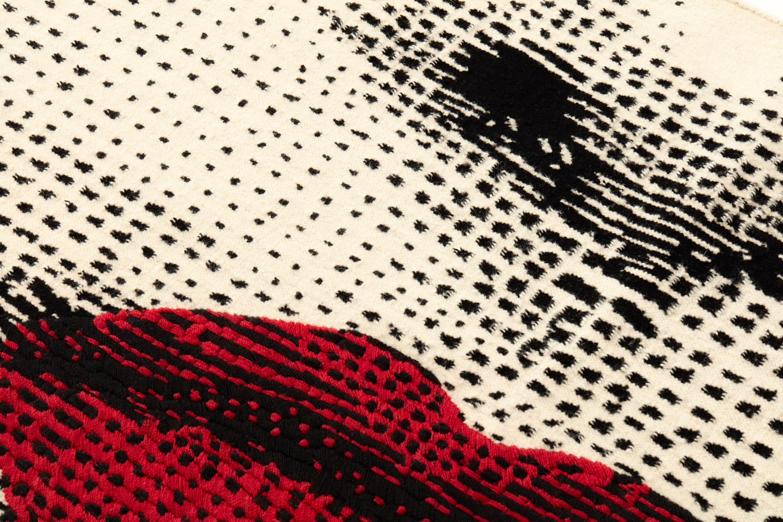 Proudly made by hand in India, this 100% wool rug translates the motif into a textile surface using the dhurrie technique, woven on a horizontal loom where colored wefts are manually interlaced into the warp to create a flat, graphic base. Hand embroidery is then applied on top as a distinct layer, enhancing the lips with raised detail—like a gesture of emphasis—intensifying their presence and giving the design a tactile, almost sculptural quality. Conceived as both a floor piece and a wall hanging, the rug becomes a versatile collectible object.