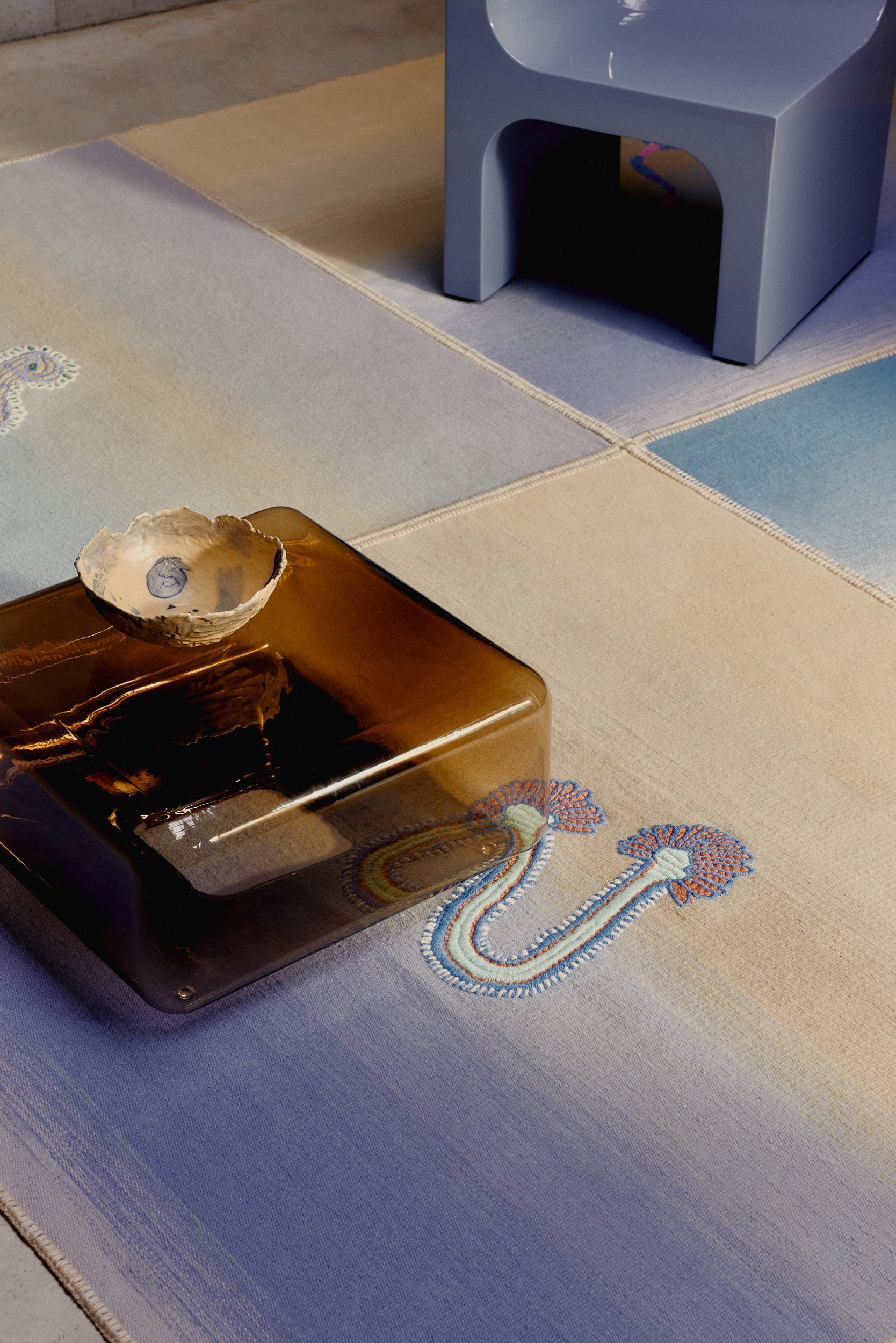 In soft blues and azures, the Cryptid rug features flowing gradients that create a sense of movement, with floating shapes that allude to manta rays, sea creatures, and airy beings drifting through the sky. This handmade dhurrie rug with embroidery brings a fluid, dreamlike presence to any space.