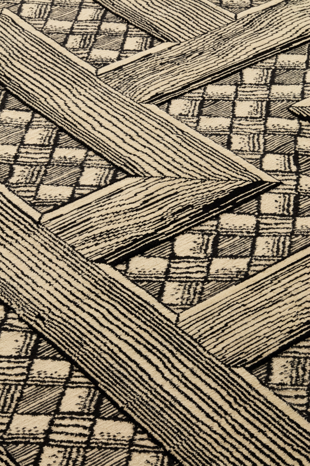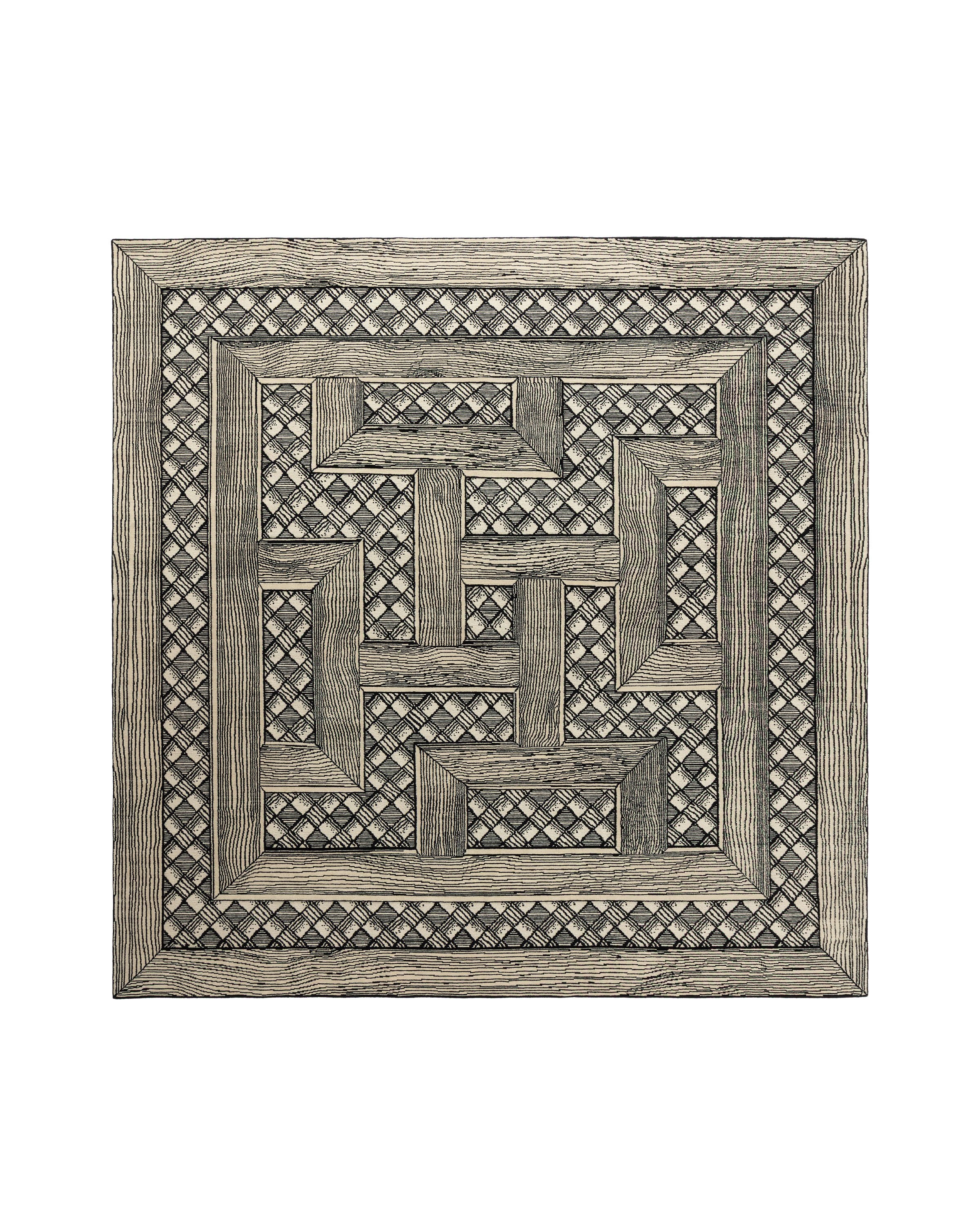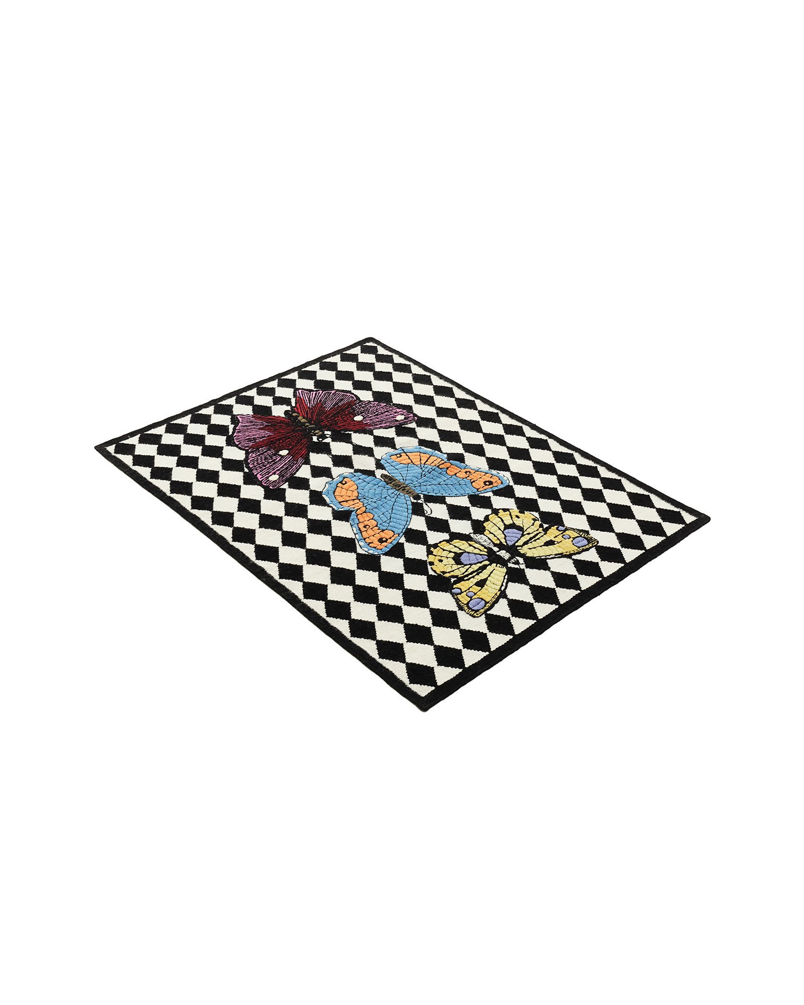 The lightness of these colorful butterflies is made even more striking by their contrast with the rigorous black-and-white geometry of the diamond pattern. Both motifs have long been part of the visual vocabulary of Fornasetti, already appearing in the 1950s on porcelain and decorative objects. It is Barnaba Fornasetti, however, who brings them together for the first time into a single, almost hypnotic composition—creating a scene that feels as though it has emerged from the collection of an entomologist.