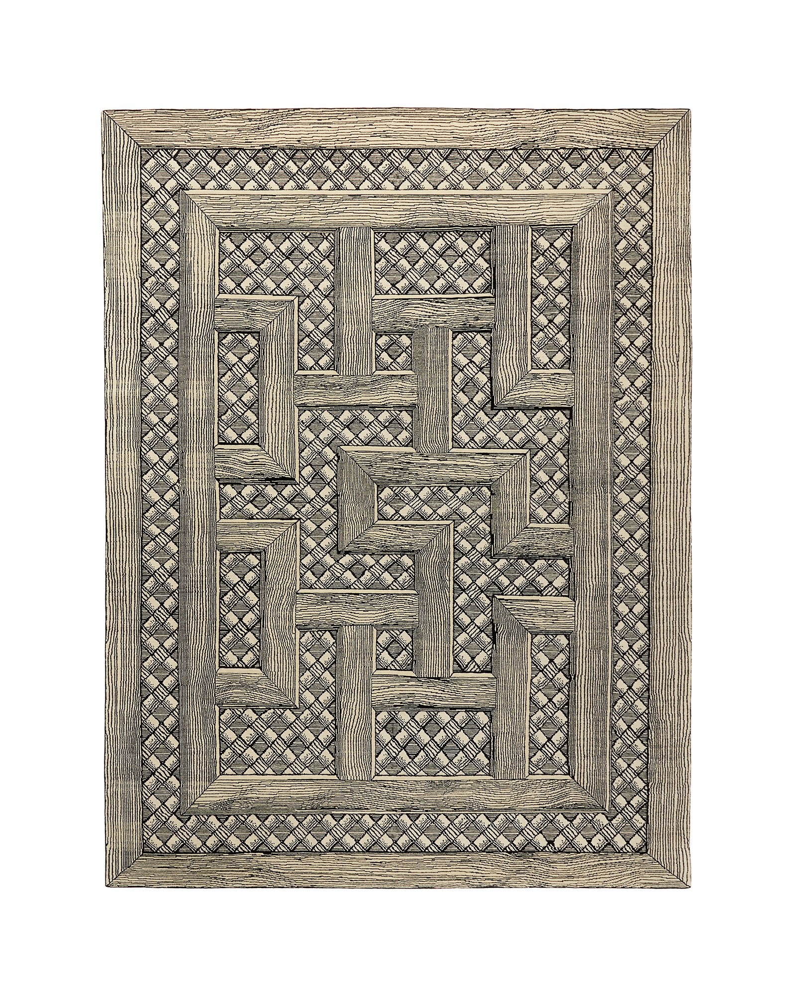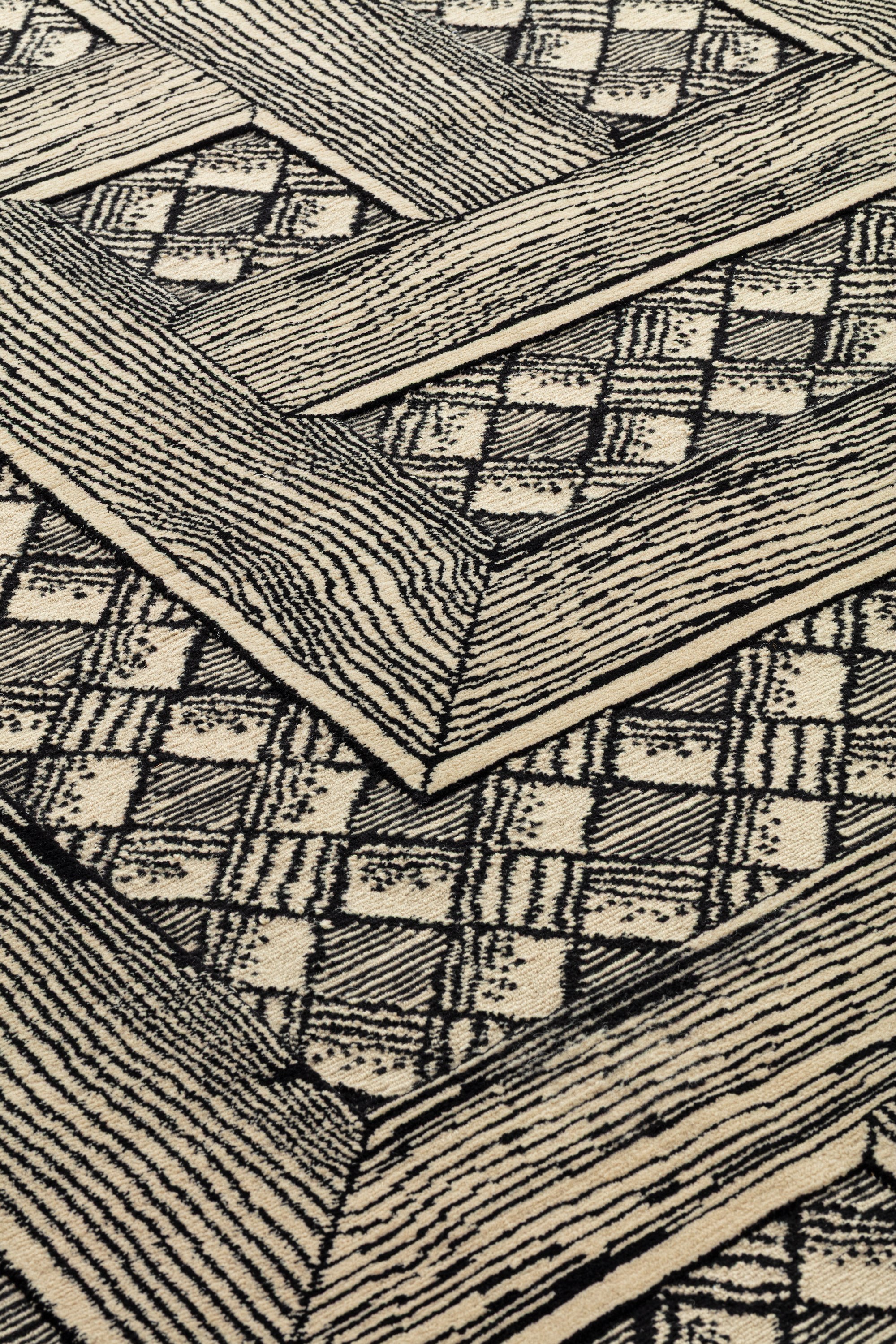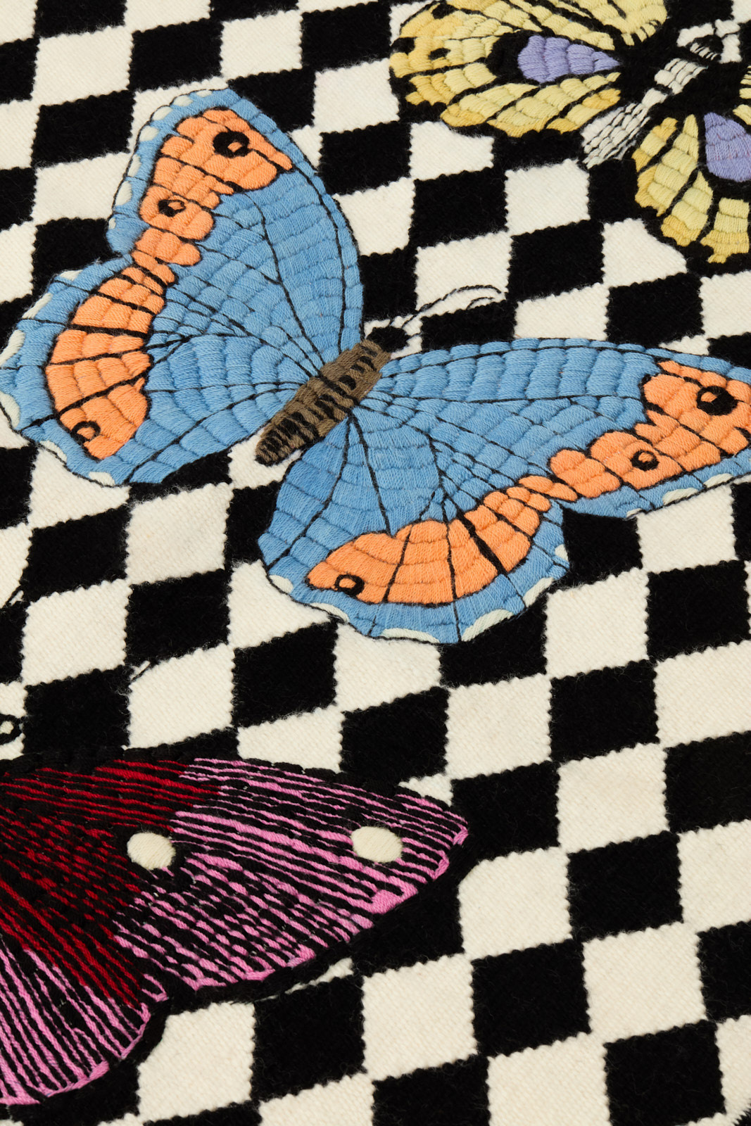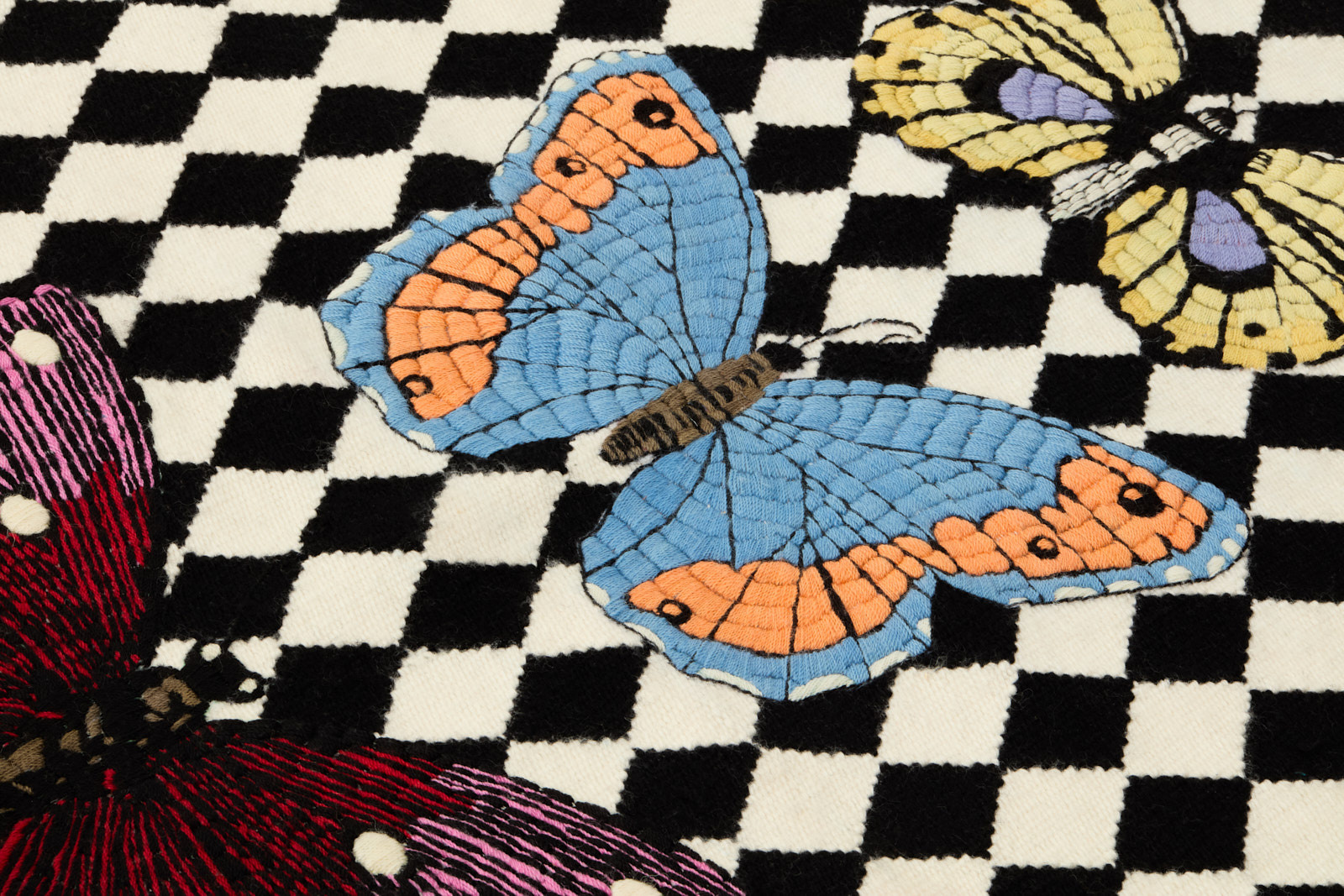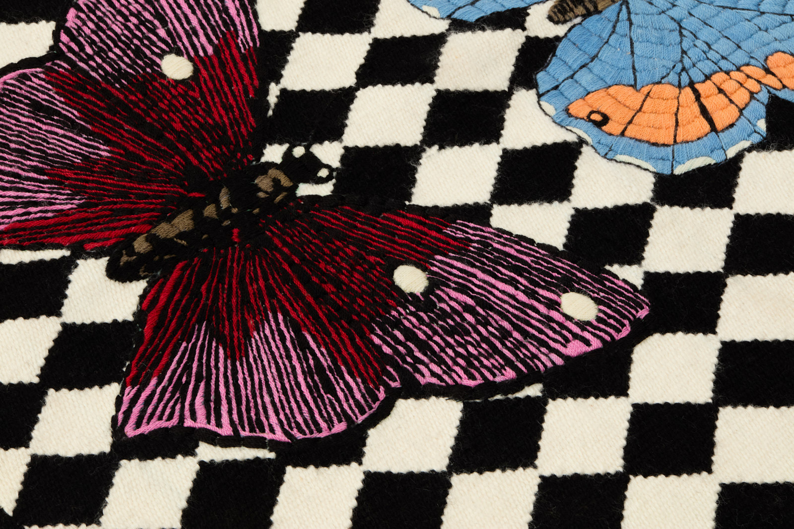 Proudly made by hand in India, this 100% wool rug is crafted using the dhurrie technique on a horizontal loom, where colored wefts are manually interlaced into the warp to form a flat, graphic surface. Hand embroidery is then applied as an additional layer, delicately highlighting the butterflies so they appear to rest lightly atop the geometric ground, enhancing their sense of movement and contrast. Conceived as both a floor piece and a wall hanging, the rug becomes a versatile collectible object.