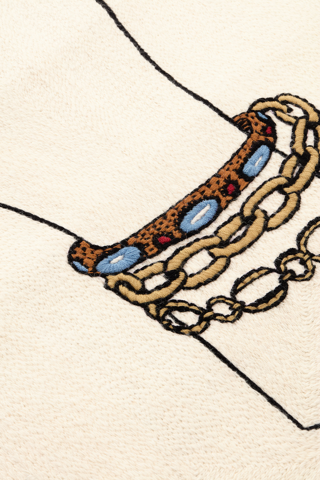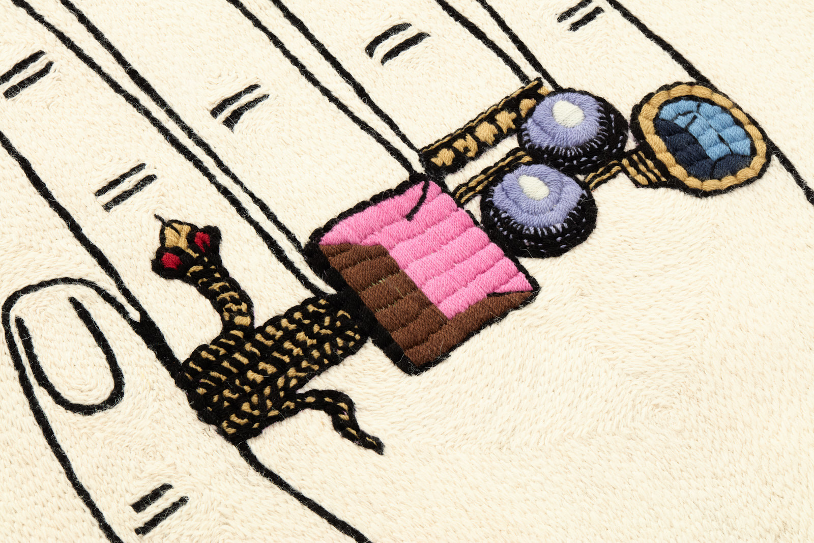 Proudly made by hand in India, this 100% wool rug is crafted using the chain stitch technique, a traditional method where loops are interlinked to form a continuous, chain-like pattern across the surface. Onto this base, hand embroidery is carefully applied as an additional layer—like a true ornament—resting on the surface much like a jewel on the hand itself, enriching the design with subtle relief and tactile detail. Conceived as both a floor piece and a wall hanging, the rug becomes a versatile object where craftsmanship and storytelling intertwine.