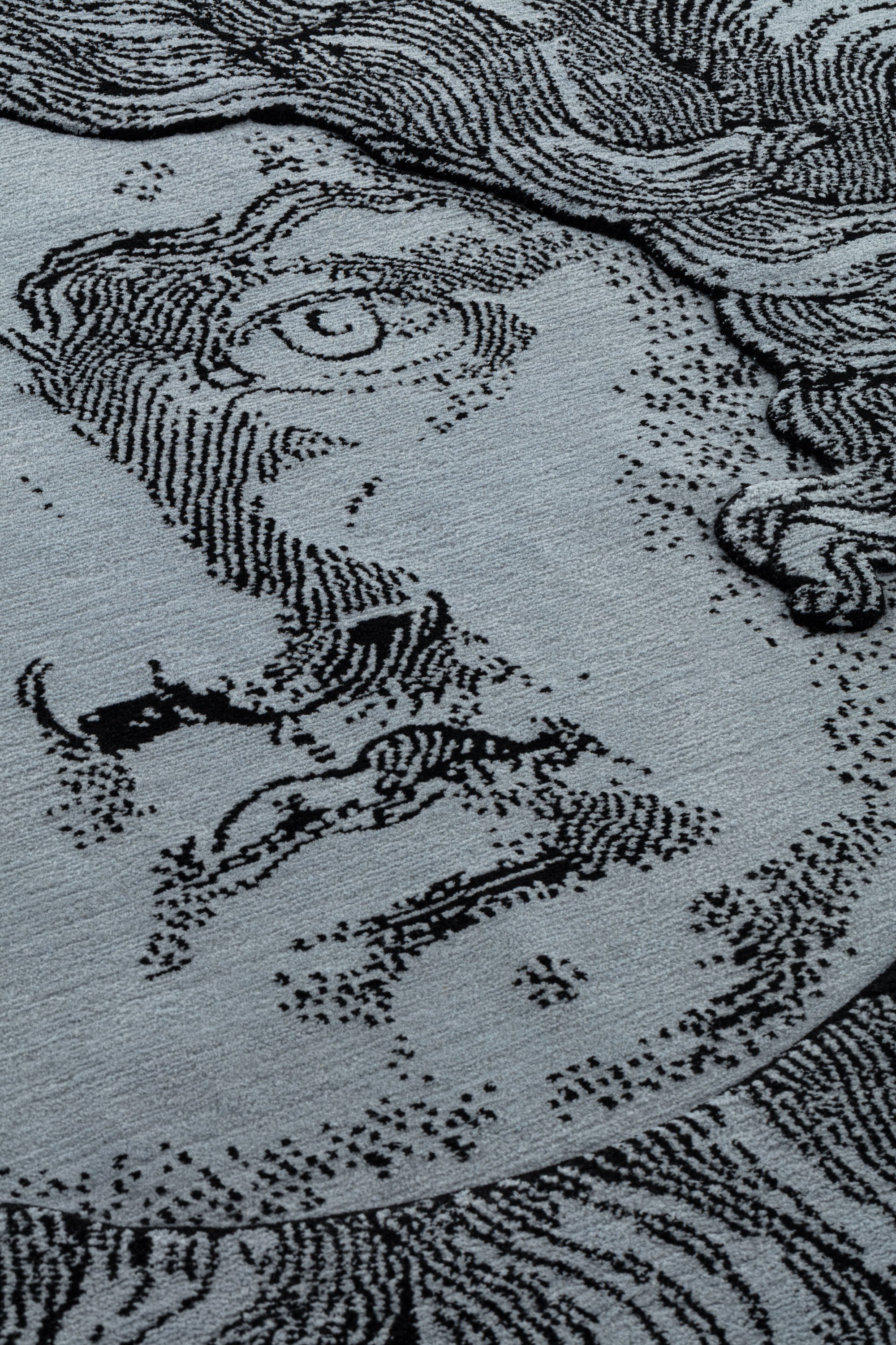 Proudly hand-knotted in Nepal from 100% New Zealand wool, the rug features varying pile heights—lower for the face and higher for the sun’s mane—enhancing the three-dimensional effect and emphasizing the intricate texture of the design.