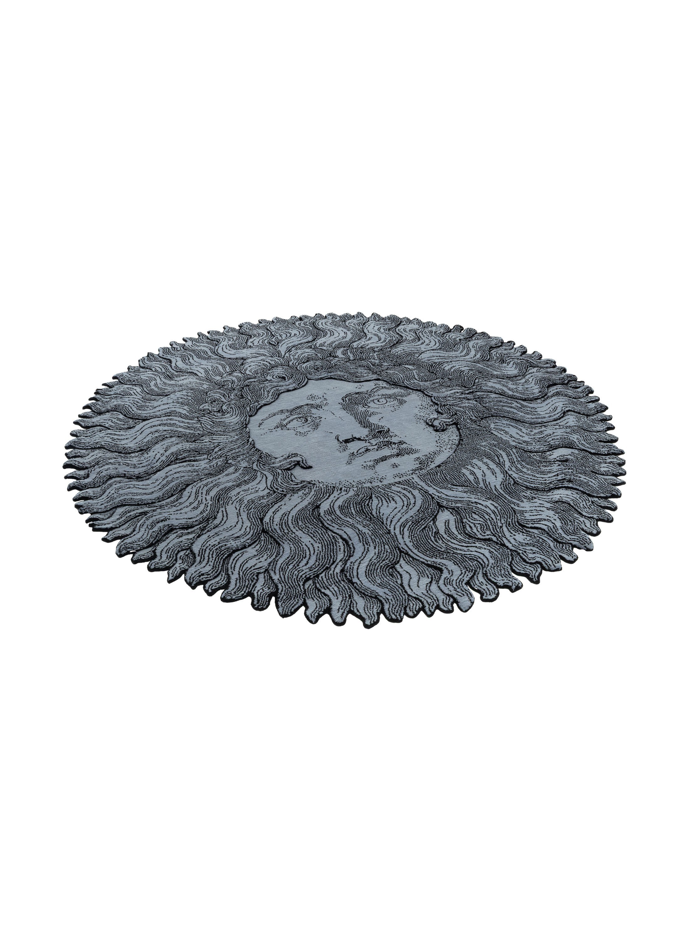 The sun holds a place of honor in Fornasetti’s iconic pantheon, and in this version it achieves unprecedented grandeur. The design sheds its usual simplicity to become dazzling and baroque: the rays multiply into a dense weave of intricate details, forming a golden, curly mane that frames the face of the celestial body. It is a tribute to Piero’s most cherished theme, here transformed into a vibrant, rich, and deeply sophisticated ornament. The rug becomes a radiant sun, commanding the space with its theatrical presence.