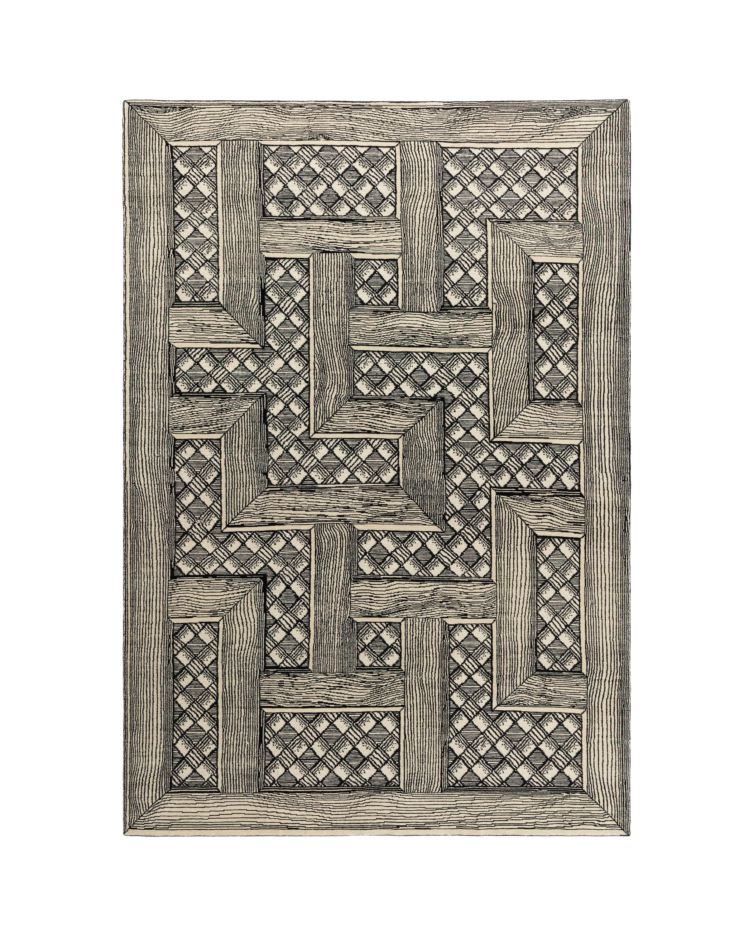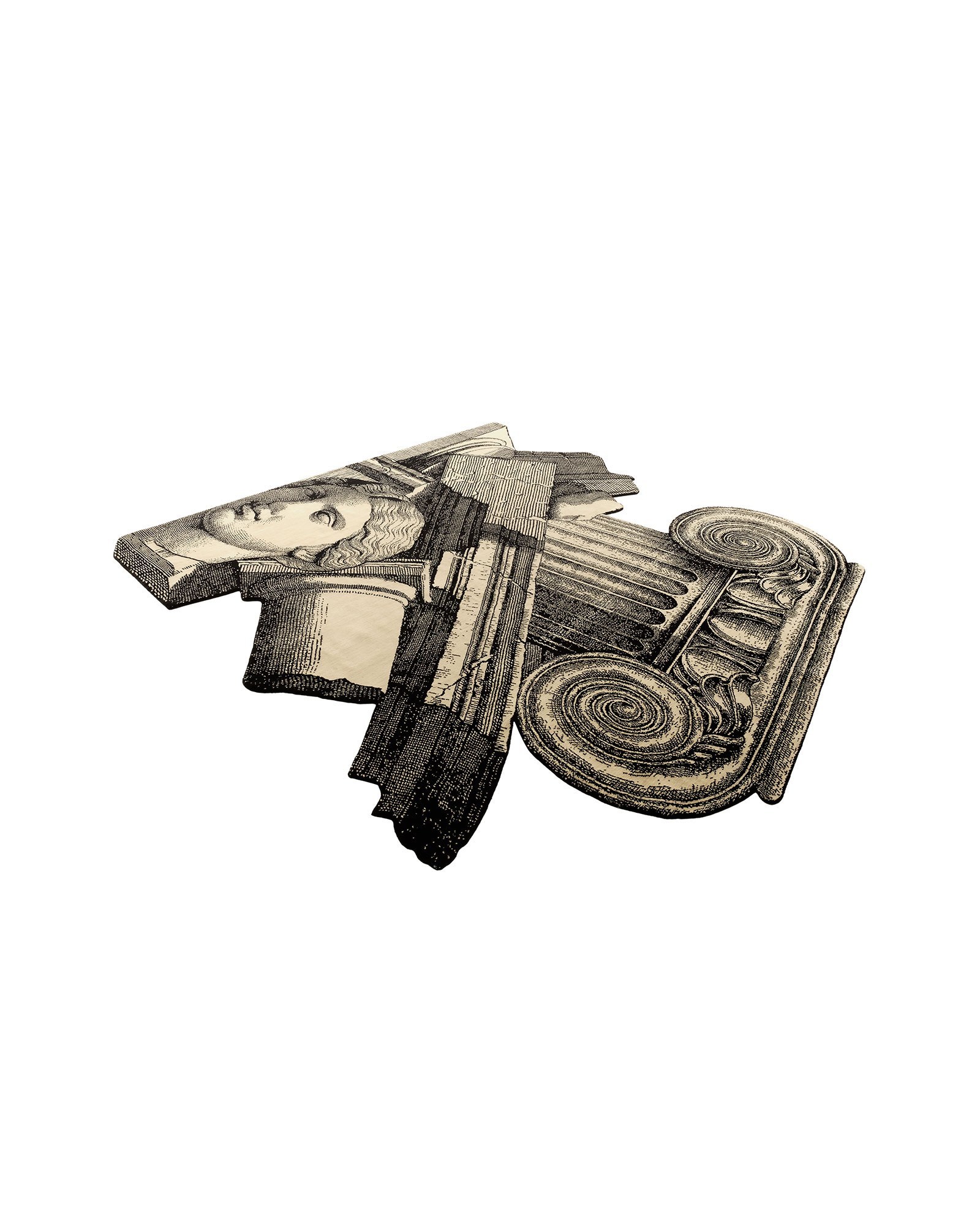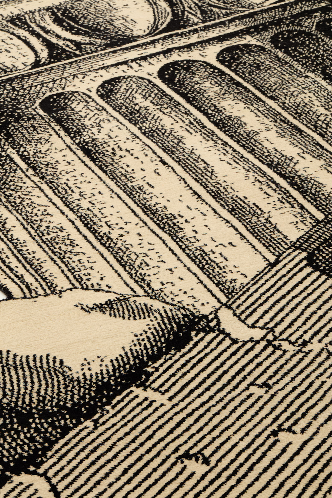 The rigor of perspective meets the playful irony of Fornasetti’s trompe-l’œil in a rug of striking theatrical impact. Designed as a dialogue between art and architecture, this piece transcends its functional role to become a three-dimensional stage set. The vestiges of antiquity emerge with the precise, incisive detail characteristic of Fornasetti, inviting the eye to wander among columns and fragments of a glorious past.
