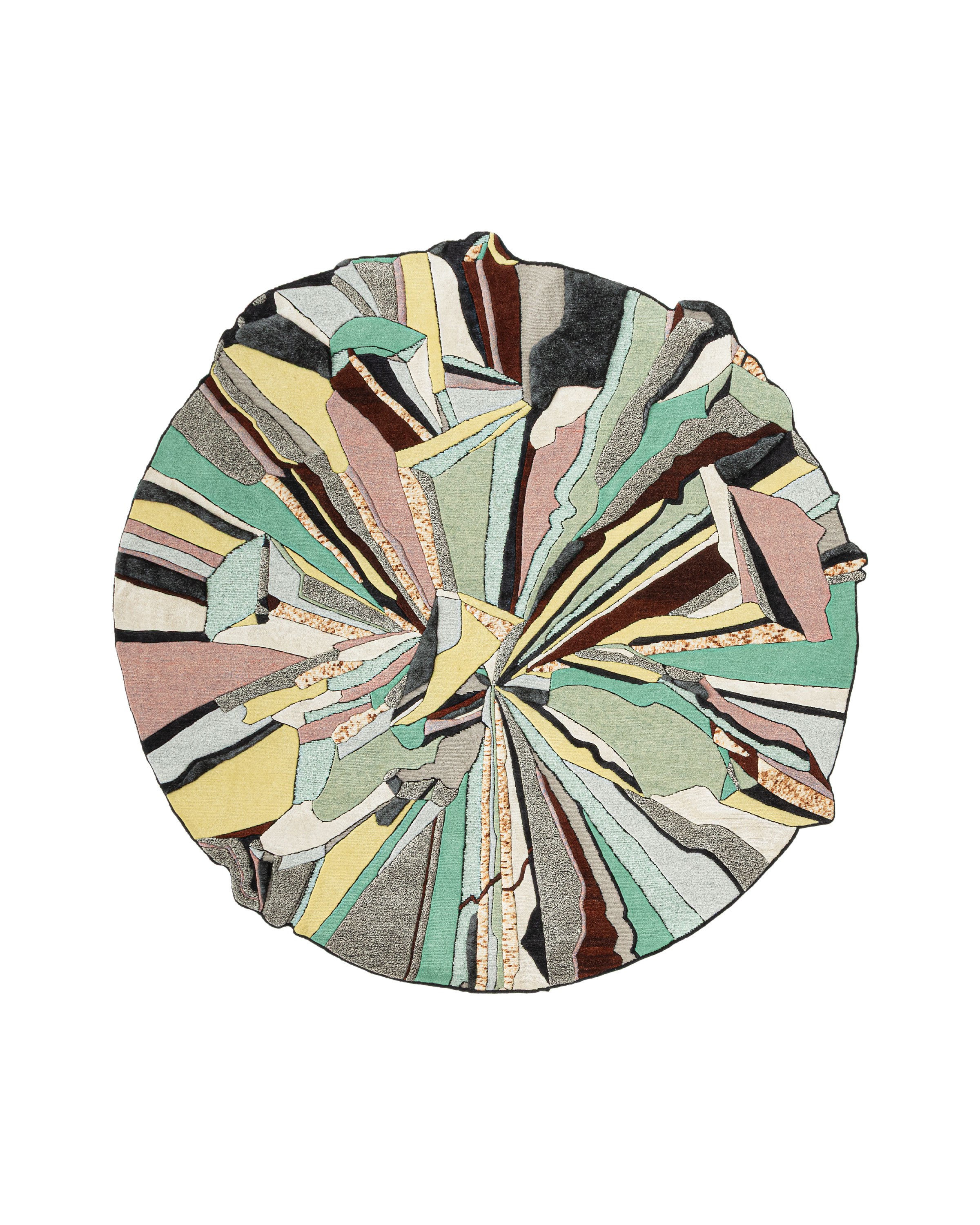 A series of rugs inspired by the collision of the man-made with nature. Each based on a different rock form, whose surface patterns are created through the organic build-up of sediment through time and a combination of materials under pressure. Each layer or facet is represented by a variety of beautiful rug-making techniques which have been developed over centuries by Tibetan artisans. Bethan uses the rock as a reference to explore the post-Instagram and Snapchat world, where the fleeting two-dimensional image, collide with a physical and tactile reality, the hyper-, and super-, fake spill into our daily lives. By imagining a visual landscape, the Super Fake Collection allows us, through its detail and dynamism, to lose ourselves and dream.